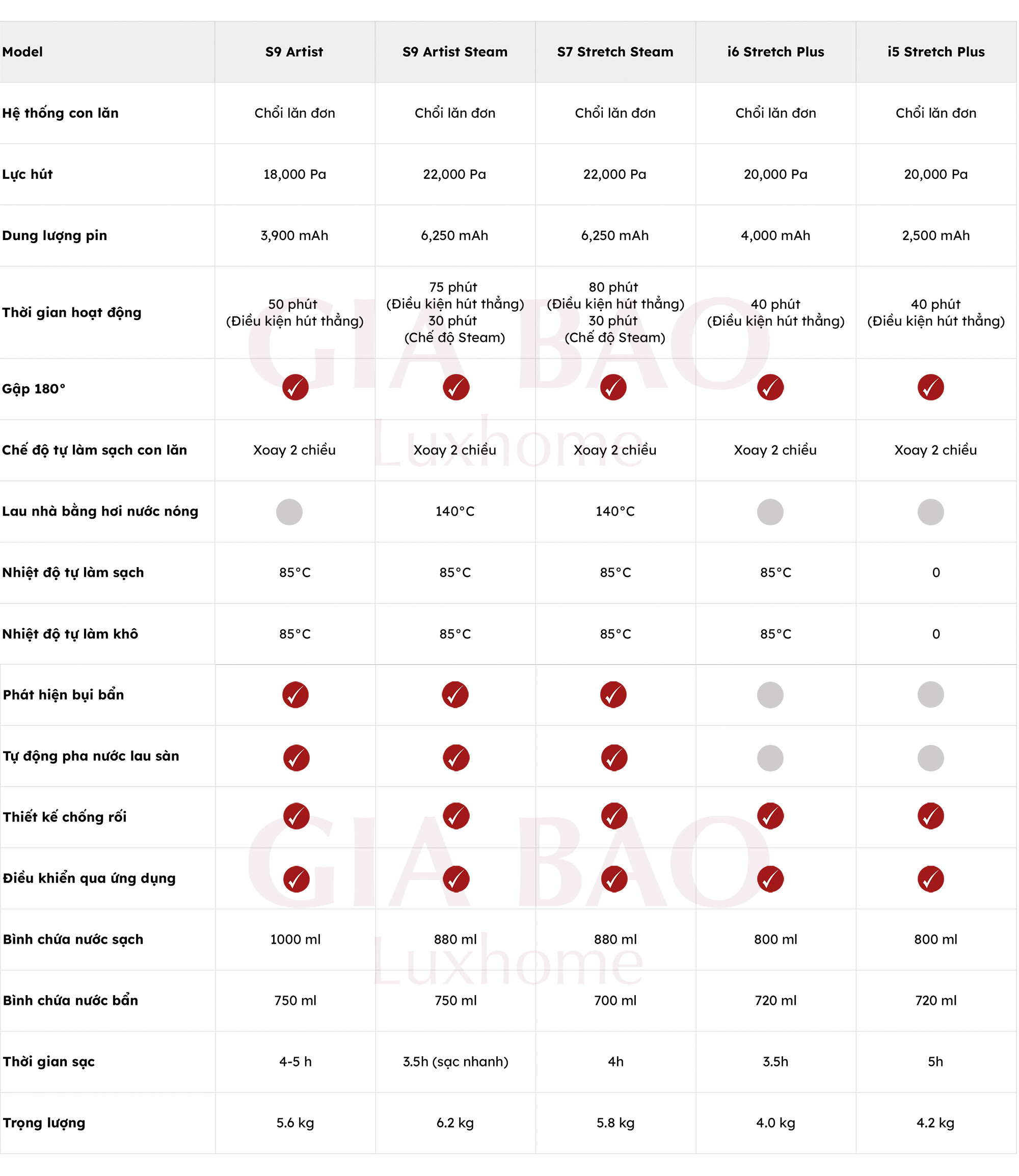 • Bảng so sánh các dòng Máy lau nhà Tineco