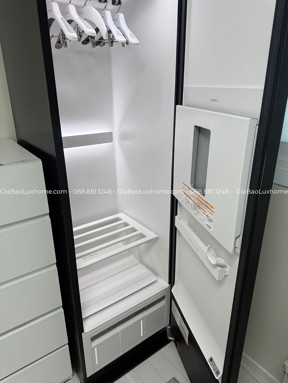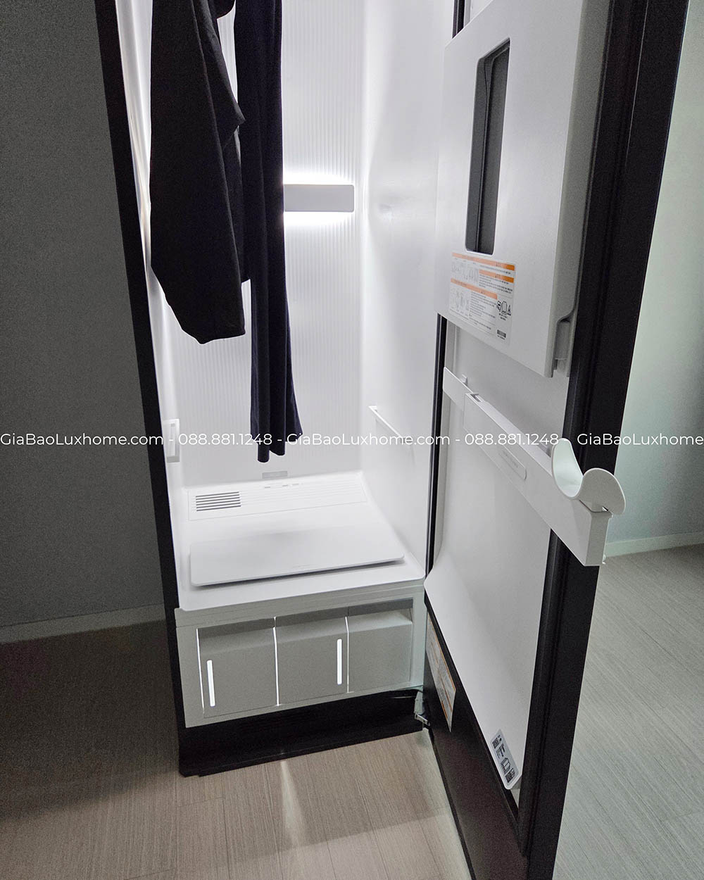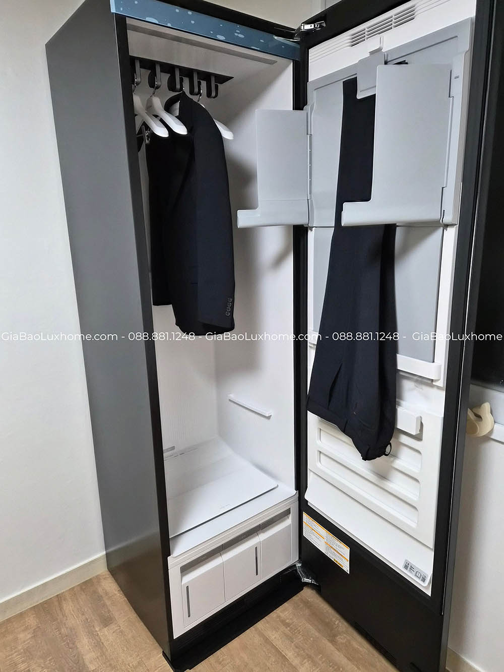 Máy được nhập khẩu nguyên chiếc từ Hàn Quốc, trang bị sẵn 5 móc treo + 1 móc là quần. Kích thước máy rộng rãi hơn cả về chiều cao và chiều sâu cho phép bạn treo những bộ trang phục “quá cỡ” như măng tô, áo lông…